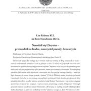 List Rektora KUL na Boże Narodzenie 2021 Narodził się Chrystus – przewodnik w drodze, nauczyciel prawdy, dawca życia Umiłowani w Chrystusie Siostry i Bracia, Przyjaciele Katolickiego Uniwersytetu Lubelskiego Jana Pawła II! Od dwóch tysięcy lat rozlega się w świecie radosna nowina, że Bóg przyszedł do ludzi – swoich umiłowanych stworzeń i stał się jednym z nich. Ta wieść wciąż jednak […]